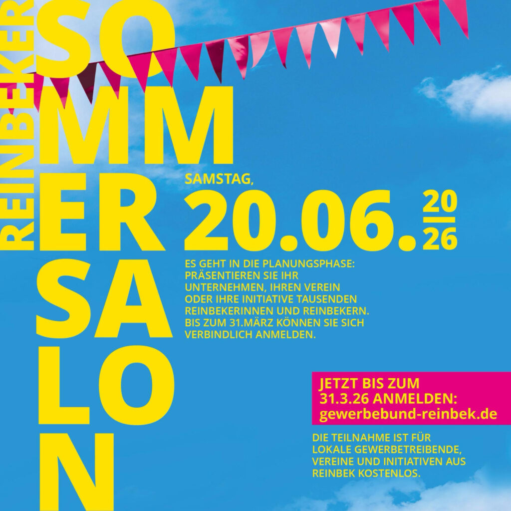 Am 20. Juni 2026 von 15:00 bis 21:00 Uhr findet auf der Bahnhofstraße in Reinbek der „Reinbeker Sommersalon 2026″ statt – die beste Gelegenheit des Jahres, sich mitten in der Innenstadt zu zeigen.